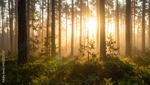 Obraz premium Sunlight shining through tall trees in forest. Landscape with bright sun and...