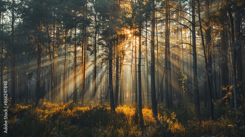 Obraz premium Sunlight shining through the branches of tall pine trees in a quiet forest,...
