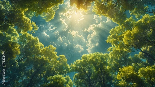 Fototapeta premium Sunlight shining through the canopy of trees in a forest. AI generative. .