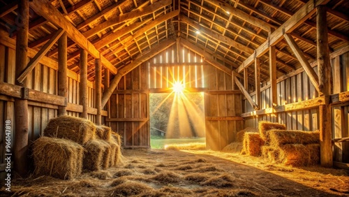 © Vibrant Visions Pixe, Fototapeta premium Sunlight shining through the cracks of an old hay barn, casting a warm glow on the rustic interior