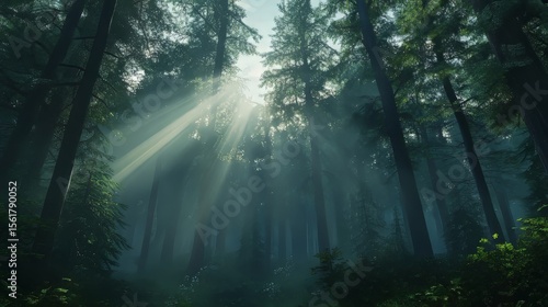© Bilal, Obraz premium Sunlight shining through the forest canopy, with a low-angle view