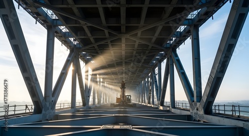 © Vektor Stokart, Fototapeta premium Sunlight shining through the steel beams of a bridge with construction vehicle in the distance ahead view