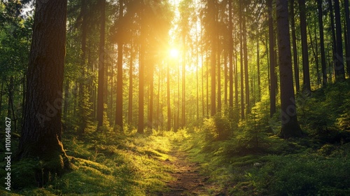 © Arsyih, Fototapeta premium Sunlight shining through the trees in a lush forest.