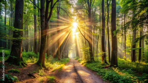 Fototapeta premium Sunlight shining through the trees on a forest trail , nature, sunlight,...