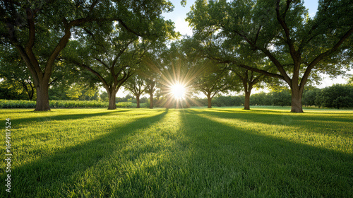 Obraz premium Sunlight shining through trees creates serene atmosphere in lush green field