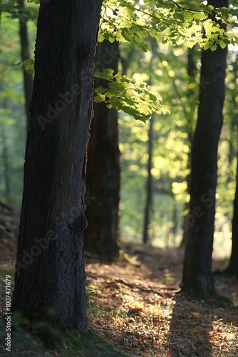 © atar, Obraz premium Sunlight Shining Through Trees in a Forest