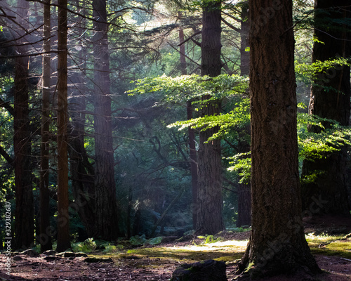 © Seadog81, Obraz premium sunlight shining through trees in a forest onto the forest floor