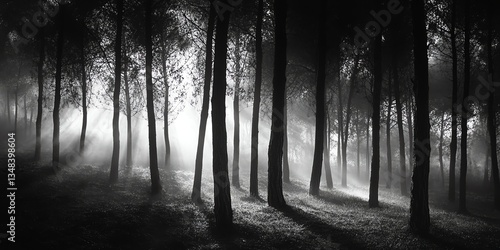 © 3dimensi2000, Fototapeta premium Sunlight Shining Through Trees in a Mystical Dark Forest Landscape