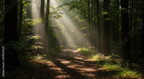 © photosstcokbd, Fototapeta premium Sunlight shining through trees in forest path