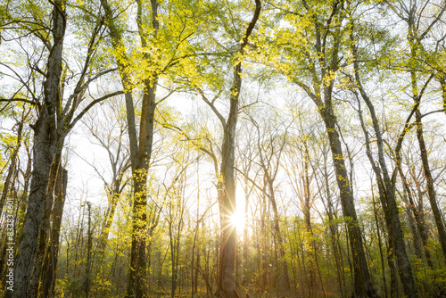 Fototapeta premium Sunlight shining through trees in forest with bright green leaves