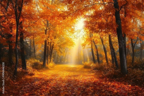 © Margarita, Obraz premium Sunlight shining through vibrant orange autumn trees illuminating a forest path covered with fallen leaves, evoking warmth and tranquility