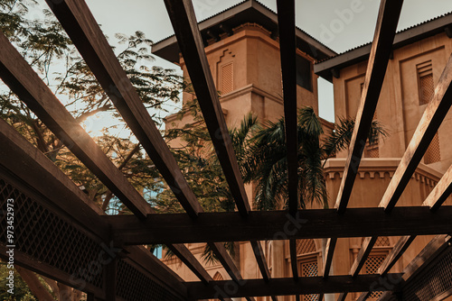 Obraz premium Sunlight shining through wooden pergola near traditional Arabic architecture