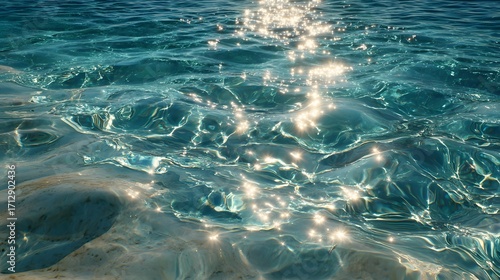 Obraz premium Sunlight Sparkles on Crystal Clear Turquoise Water Over a Sandy Seabed.