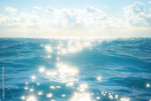 Obraz premium Sunlight sparkling on clear blue ocean waves under a bright cloudy sky...