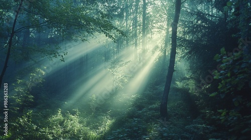 Obraz premium Sunlight Streaking Through a Misty Forest