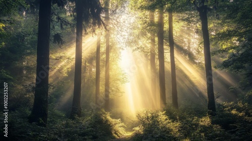 Fototapeta premium Sunlight Streaks Through a Misty Forest