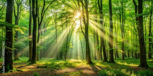 Fototapeta premium Sunlight Streaks Through a Verdant Forest Canopy, Illuminating the Lush...