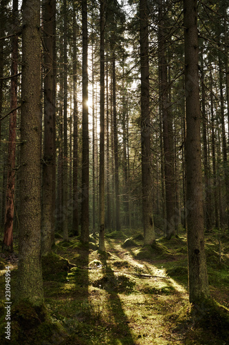 Fototapeta premium Sunlight streaming through a autumn pine forest