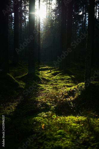Fototapeta premium Sunlight streaming through a autumn pine forest