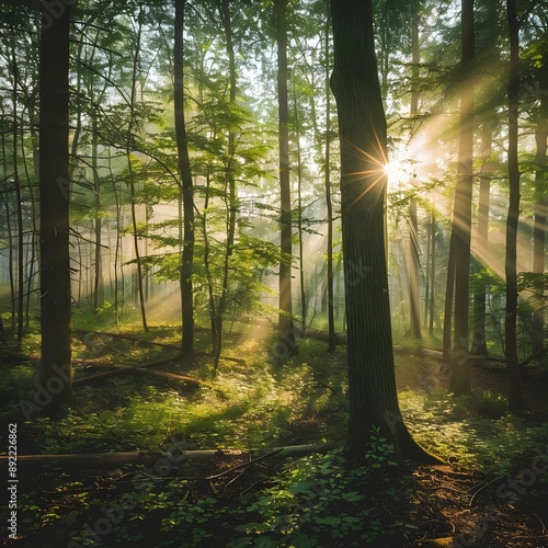 © Amir, Obraz premium Sunlight streaming through a dense forest, casting golden rays and illuminating the lush green foliage, creating a serene and magical atmosphere.