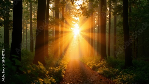 Obraz premium Sunlight streaming through a dense forest, illuminating a path with golden rays.
