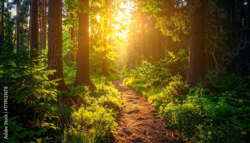 Obraz premium Sunlight Streaming Through a Dense Forest Path with Green Foliage, Golden...