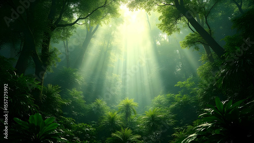 © Chandra, Obraz premium Sunlight streaming through a dense green forest area
