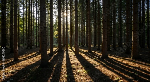 Obraz premium Sunlight Streaming Through A Dense Pine Forest.