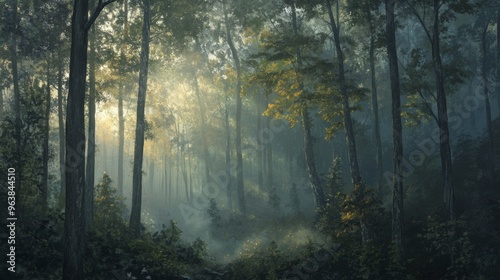 Naklejka premium Sunlight Streaming Through a Foggy Forest