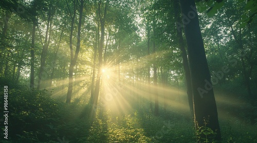© Koplexs-Stock, Fototapeta premium Sunlight streaming through a misty forest