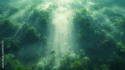 © Muamanah, Fototapeta premium Sunlight Streaming Through a Misty Forest Canopy