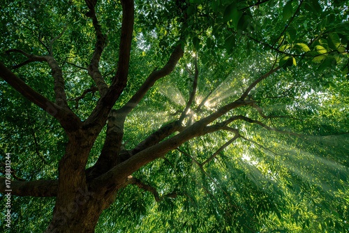 © Rawdah, Naklejka premium Sunlight Streaming Through a Vibrant Green Tree Canopy in a Forest from Low Angle View Point