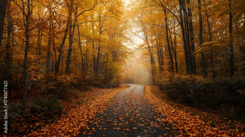 Fototapeta premium Sunlight streaming through autumn forest trees onto a leaf covered path