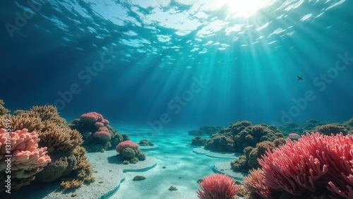 Obraz premium Sunlight streaming through clear ocean water over a coral reef with colorful...