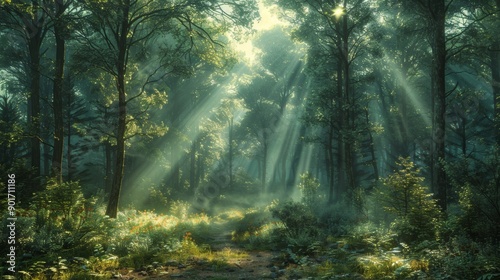 Obraz premium Sunlight Streaming Through Dense Forest Canopy During Early Morning Hours in...