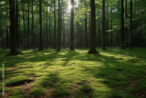 © Vasyl, Obraz premium Sunlight streaming through dense green forest with mossy ground in spring morning