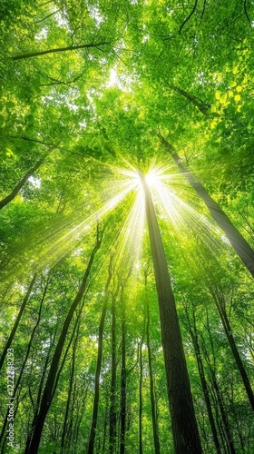 Naklejka premium Sunlight Streaming Through Dense Tree Canopy in Serene Forest Environment,...