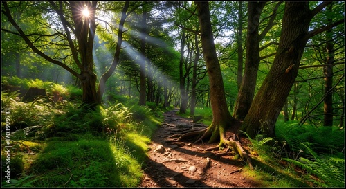 Obraz premium Sunlight Streaming Through Forest Canopy - A Serene Woodland Scene.