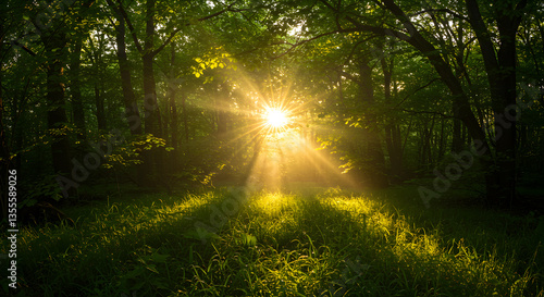 Fototapeta premium Sunlight Streaming Through Forest Canopy Illuminating Green Meadow Scene