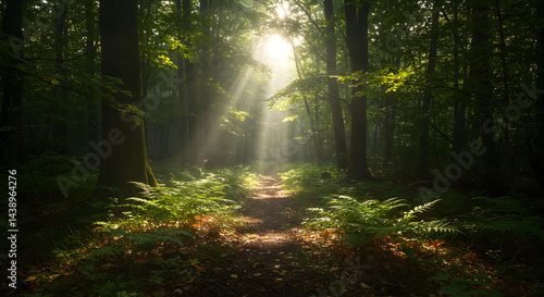 © Laodefardin, Fototapeta premium Sunlight Streaming Through Forest Trees Illuminating a Path and Ferns