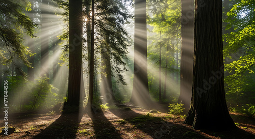 © MdHasan, Obraz premium Sunlight Streaming Through Forest Trees in Morning