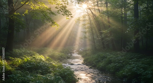 © Jeny, Obraz premium Sunlight streaming through forest trees onto a tranquil stream.
