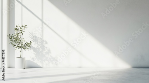 Obraz premium Sunlight streaming through large windows onto a minimalistic interior with a potted plant during the day