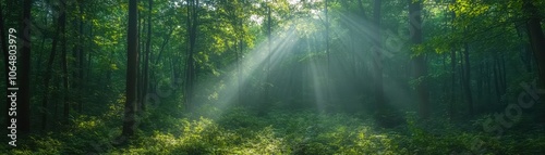 Obraz premium Sunlight Streaming Through Lush Green Forest Canopy Creating a Serene and...