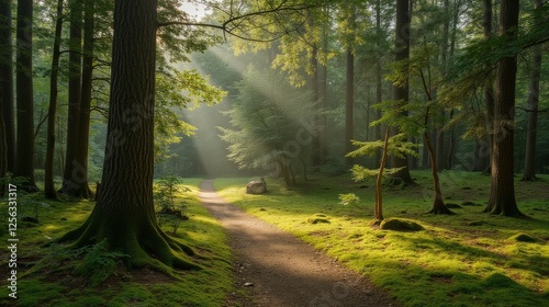 © Kitta Studio, Obraz premium Sunlight Streaming Through Lush Green Forest With Tranquil Pathway