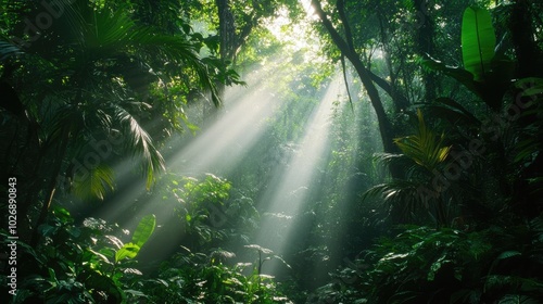 © somsri, Obraz premium Sunlight Streaming Through Lush Jungle Canopy