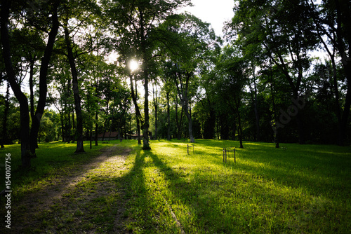 © AS Photo Family, Fototapeta premium Sunlight streaming through lush trees in a serene forest setting
