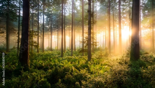 Naklejka premium Sunlight Streaming Through Misty Forest Trees, Serene Woodland with Fog and Sunlight Rays, Tranquil Forest Scene with Golden Sunrise Glow