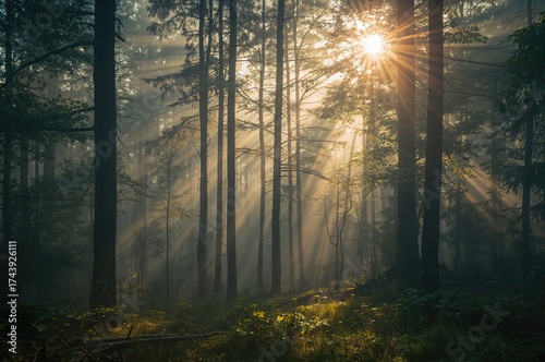 Fototapeta premium Sunlight streaming through misty woodland in a classic retro style