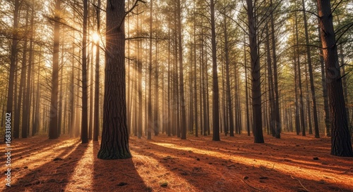 Fototapeta premium Sunlight streaming through pine forest trees during autumn